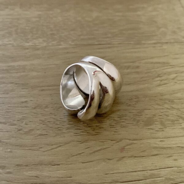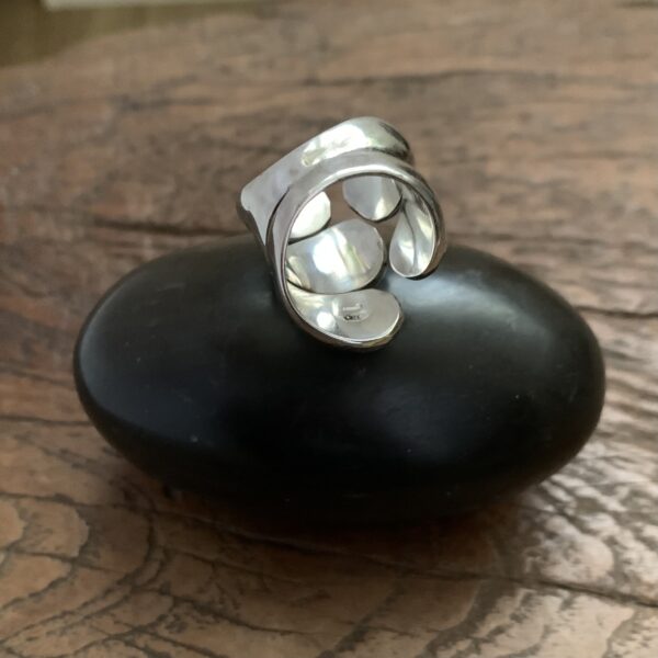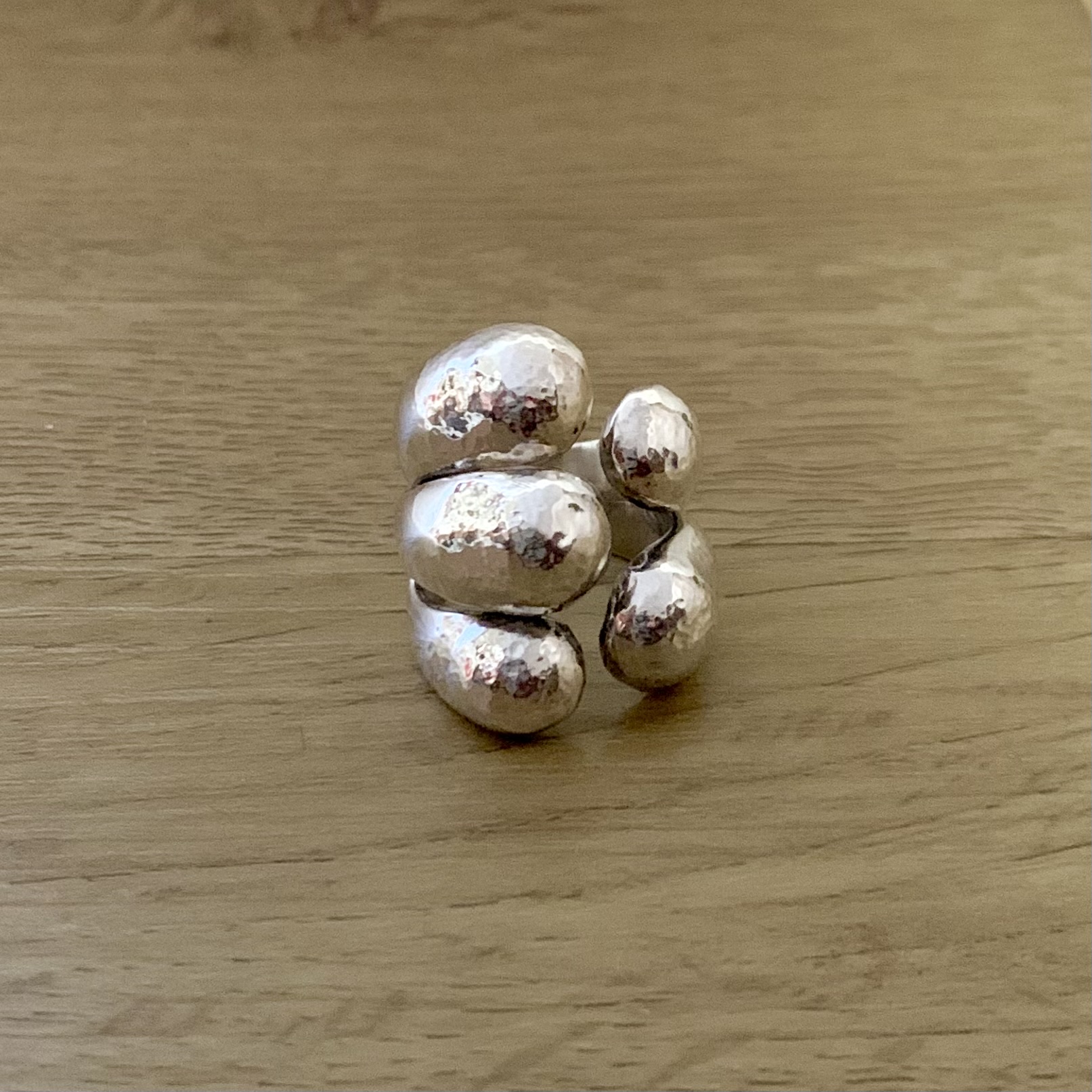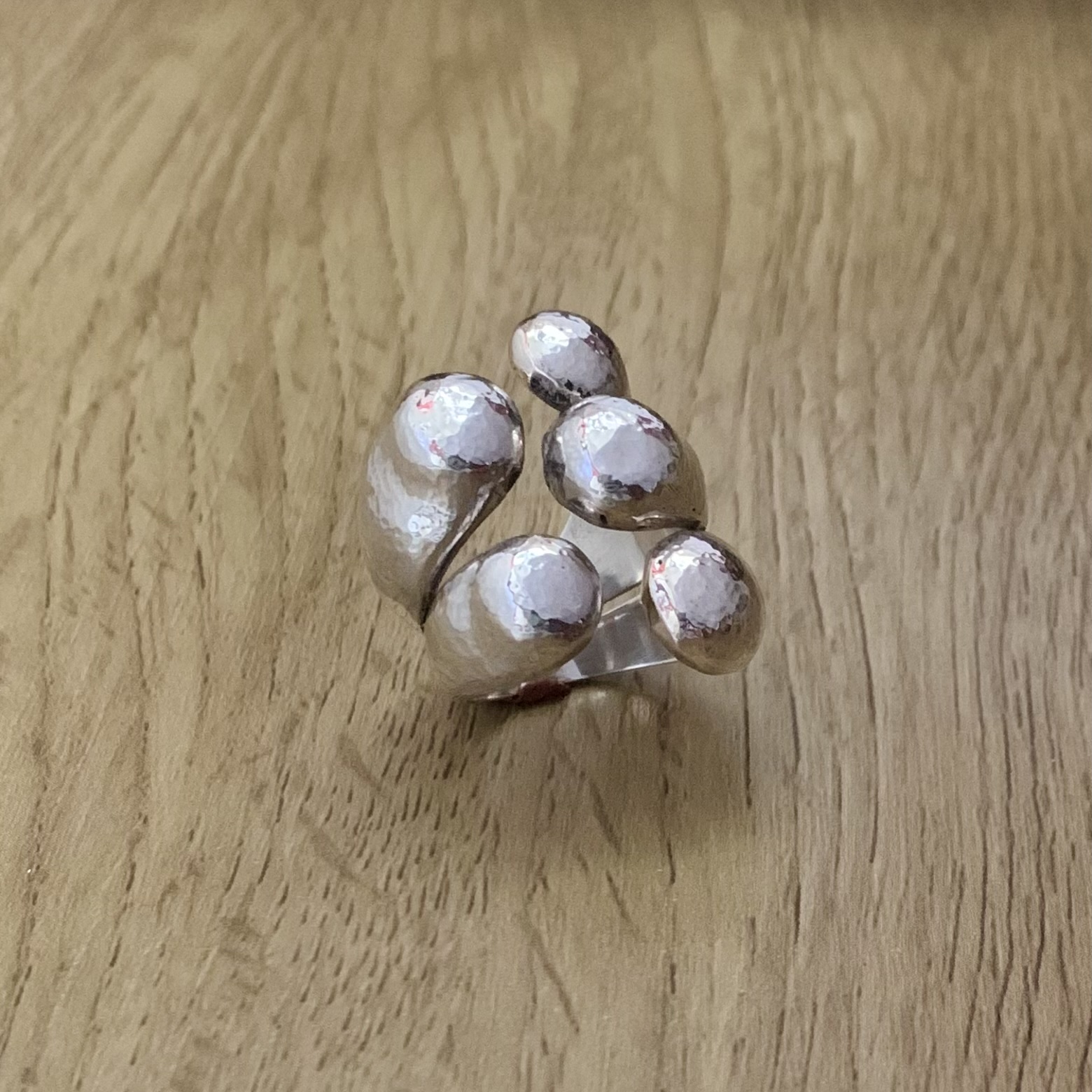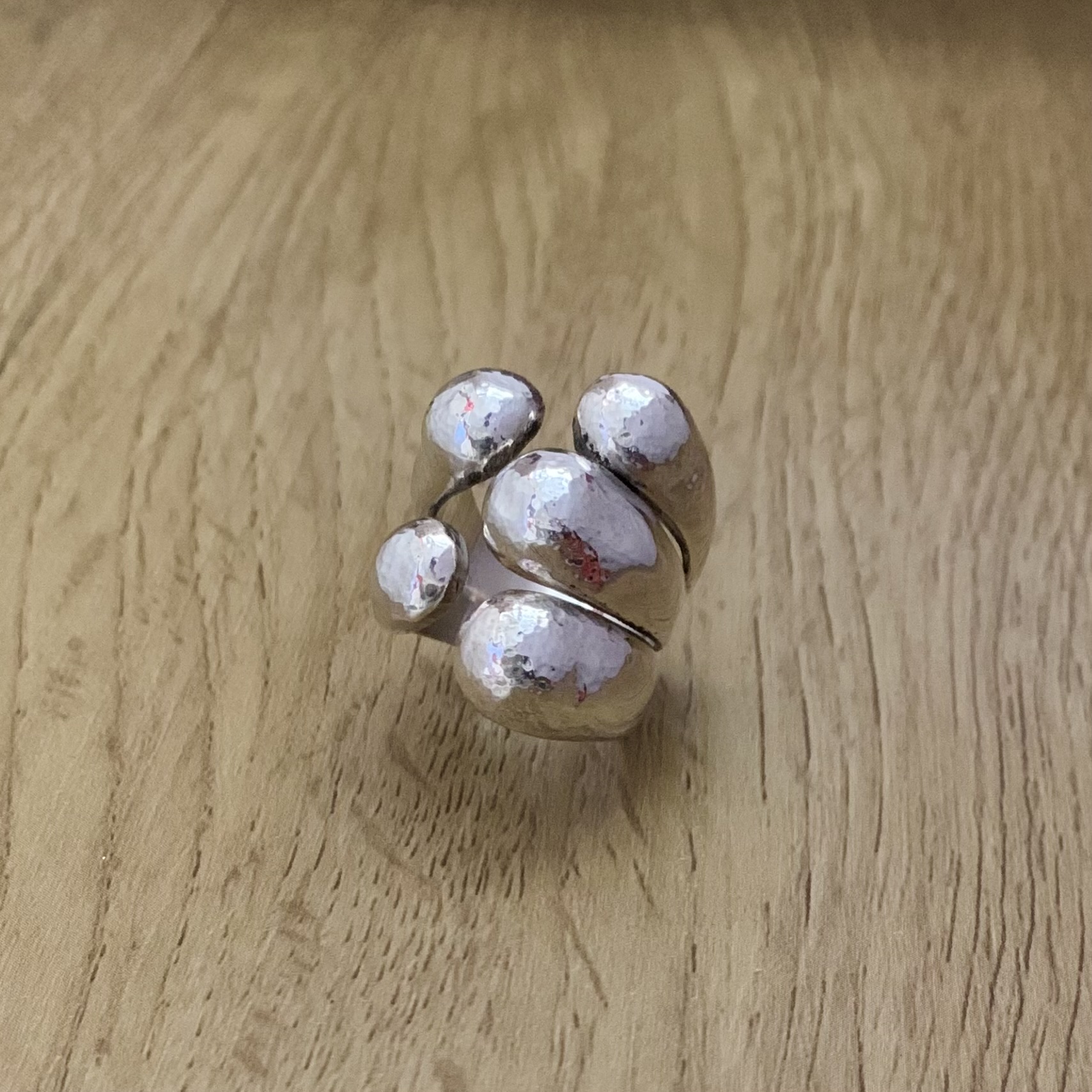 Anello in argento 925 lavorato a mano. Cinque elementi che evocano la nascita del fiore, bombati, lievemente martellati. Da un lato due, di dimensioni e bombatura diverse, uno più sopraelevato rispetto all’altro. Dall’altro lato tre elementi, sempre di dimensioni diverse, due leggermente più grandi di cui uno lievemente più alto, il terzo più piccolo. Un incontro di carpelli, di abbracci, in una struttura solida e corposa totalmente liscia, la lavorazione martellata è lieve e solo sulla parte superiore. Aperto, quindi leggermente regolabile.